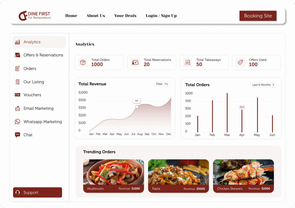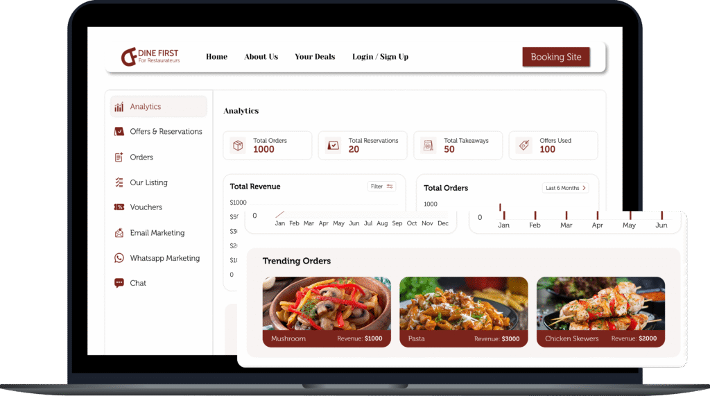 For Existing Restaurants: Offer a powerful dashboard to manage bookings, track performance, update menus, run campaigns, and engage customers — all in one place.