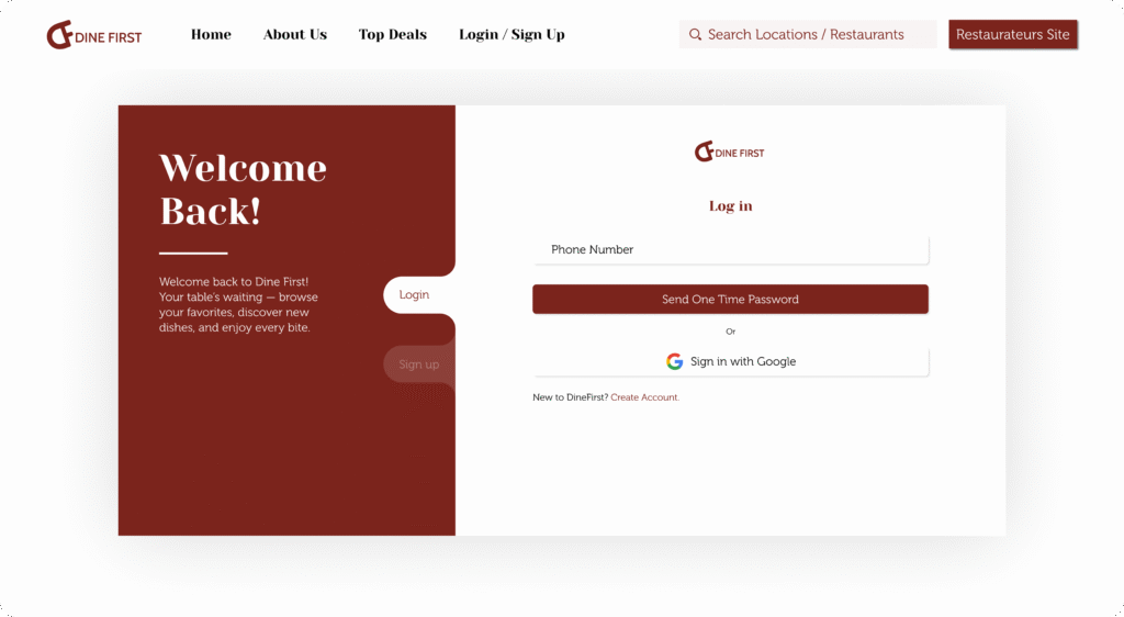 The login and signup pages on the DineFirst website are designed to provide a seamless entry point for both diners and restaurant owners. The layout is clean and straightforward, with clear input fields and CTA buttons that guide users through the authentication process without confusion. Users can sign in or create an account using email or phone number, with the option to integrate social login for faster access. Form validation, error messages, and subtle animations enhance the usability, making the experience intuitive and friction-free.